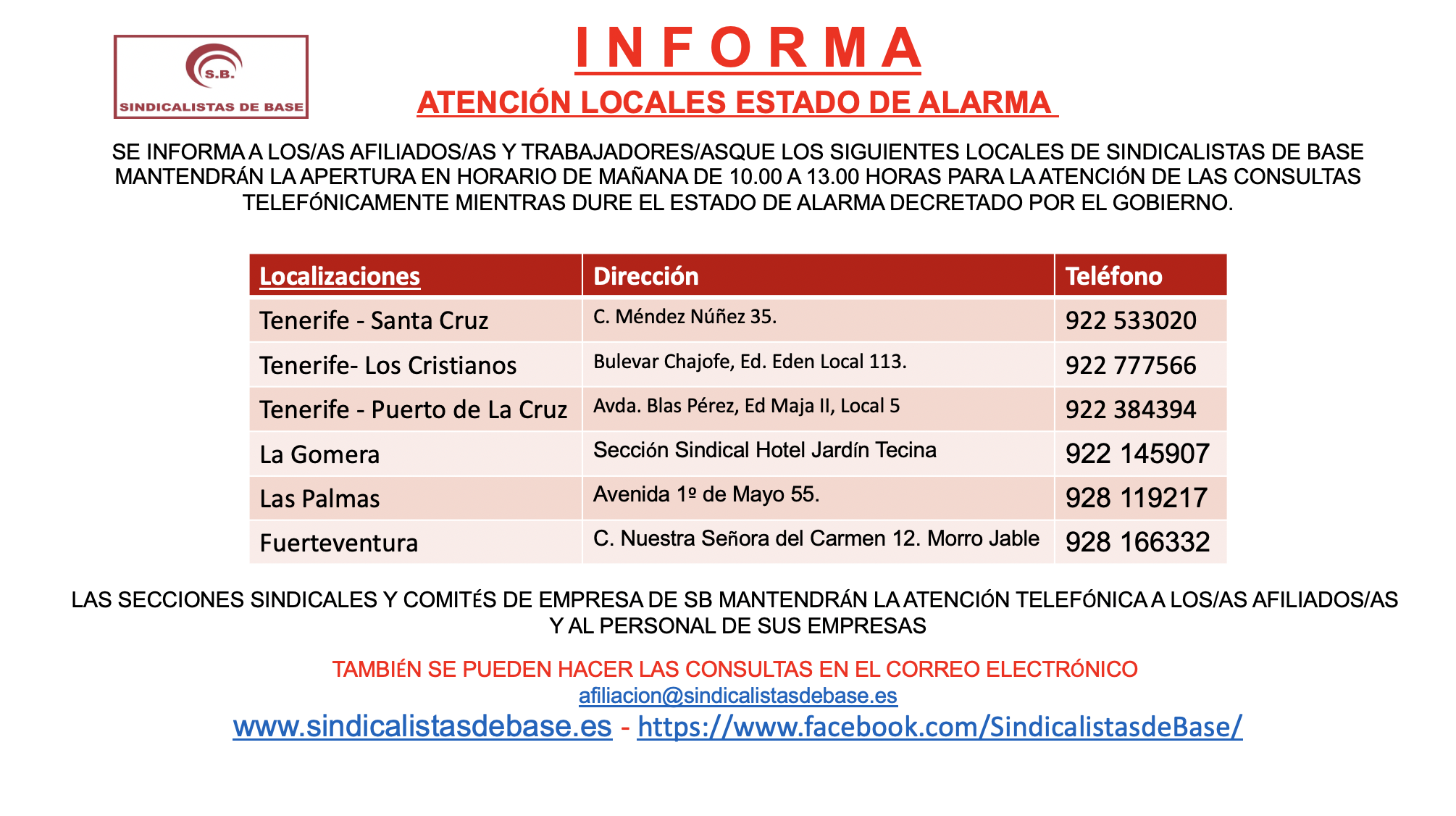 SE INFORMA A LOS/AS AFILIADOS/AS Y TRABAJADORES/ASQUE LOS SIGUIENTES LOCALES DE SINDICALISTAS DE BASE MANTENDRÁN LA APERTURA EN HORARIO DE MAÑANA DE 10.00 A 13.00 HORAS PARA LA ATENCIÓN DE LAS CONSULTAS TELEFÓNICAMENTE MIENTRAS DURE EL ESTADO DE ALARMA DECRETADO POR EL GOBIERNO.