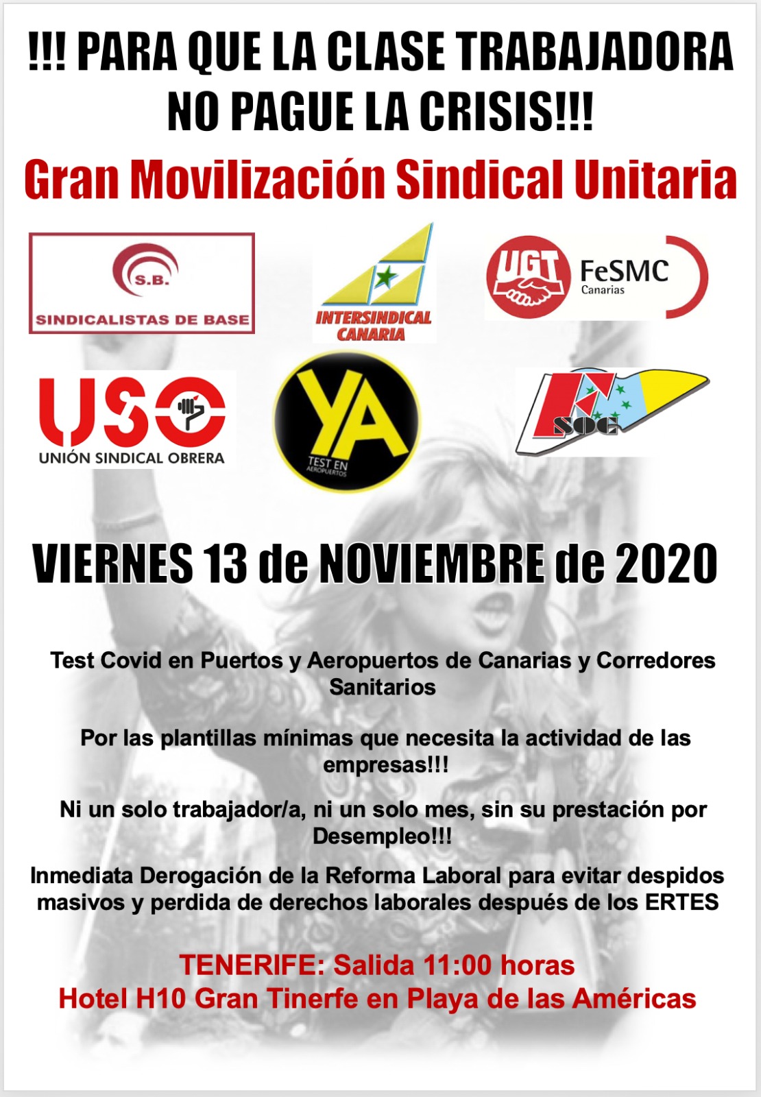 Así mismo los sindicatos UGT, SB, IC, USO y FSOC mantenemos la convocatoria unitaria de una Gran Movilización de Trabajadores/as el próximo 13 de Noviembre que se desarrollará en las islas de Tenerife, Gran Canaria, Lanzarote, Fuerteventura, La Gomera y La Palma, exigiendo al Gobierno de España que dichos test se realicen a la entrada y salida de pasajeros en los puertos y aeropuertos de Canarias, junto al resto de reivindicaciones establecidas en la Resolución Sindical Unitaria del pasado 20 de Octubre de 2020.