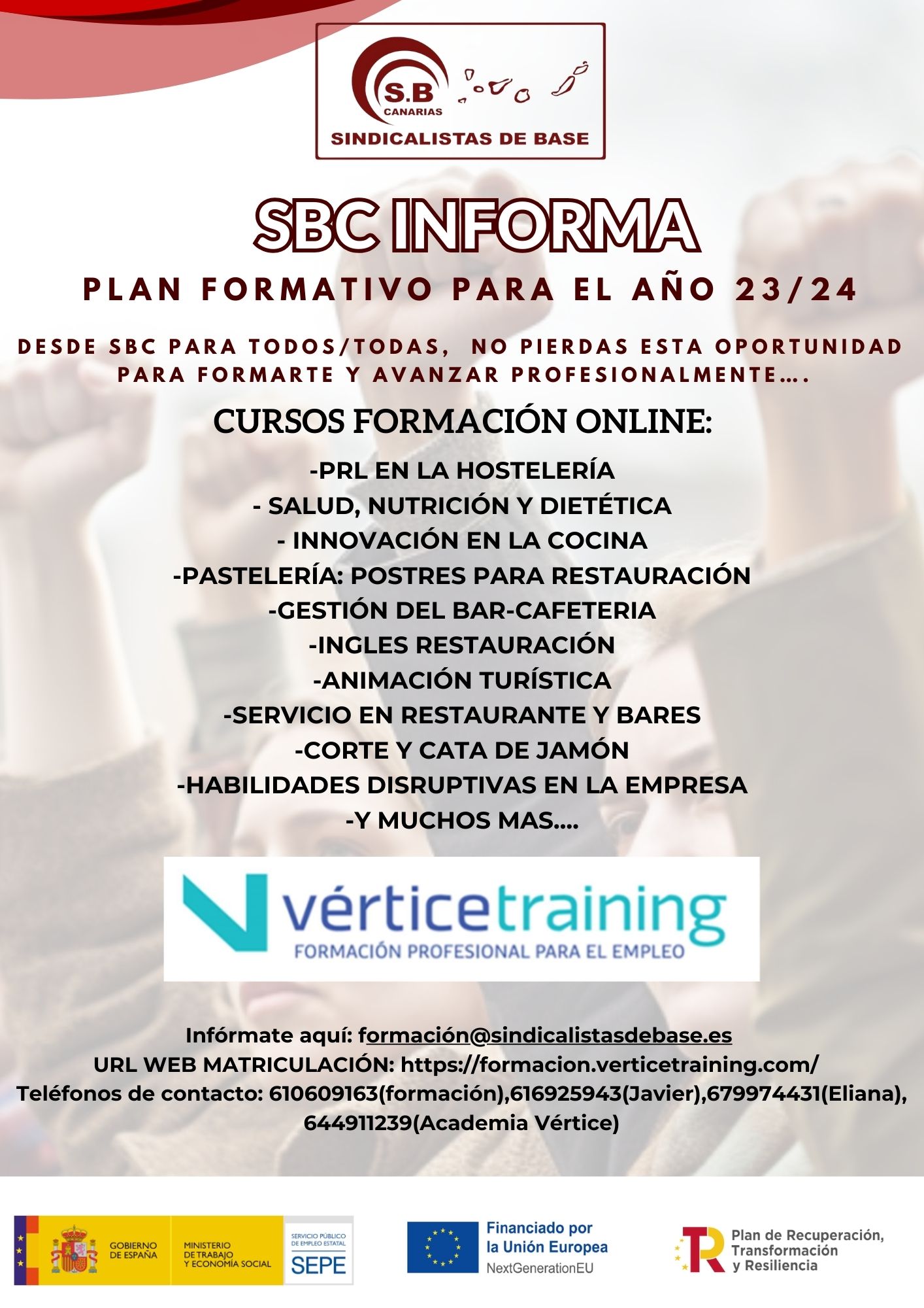 Desde Sindicalistas de Base Canarias (SBC), nos complace anunciar nuestro ambicioso Plan Formativo para el año 23/24. Esta es una oportunidad única para todos aquellos que buscan mejorar sus habilidades, avanzar en su carrera y adaptarse a las demandas cambiantes del mercado laboral.