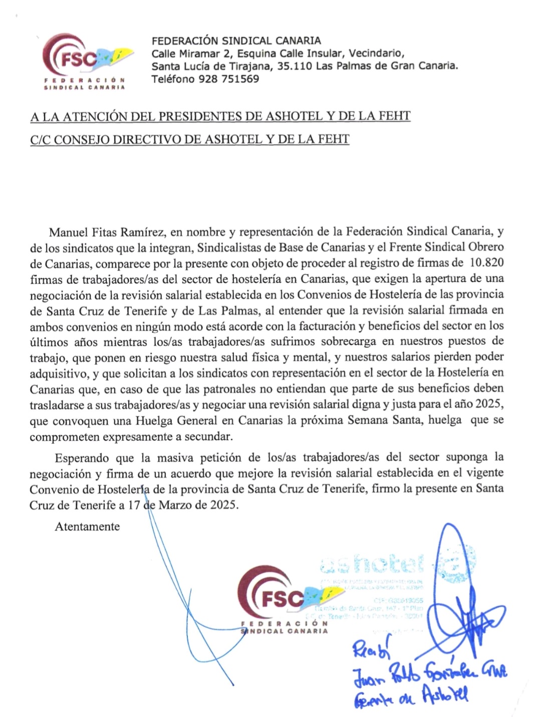 La Federación Sindical Canarias, que integra Sindicalistas de Base de Canarias y el Frente Sindical Obrero de Canarias, dentro del ámbito de las reivindicaciones de la Mesa Sindical de Hostelería de Canarias, en de la que forman parte junto a la FSC los sindicatos UGT, IC y USO, hemos registrado en la mañana de hoy en las patronales turísticas ASHOTEL y FEHT 10.820 firmas de trabajadores/as del sector en Canarias que se dirigen a dichas patronales. con objeto de solicitarles la apertura de una negociación de la revisión salarial establecida en los Convenios de Hostelería de las provincias de Las Palmas y Santa Cruz de Tenerife, al entender que la revisión salarial firmada en ambos convenios en ningún modo está acorde con la facturación y beneficios del sector en los últimos años mientras los/as trabajadores/as sufrimos sobrecarga en nuestros puestos de trabajo, que ponen en riesgo nuestra salud física y mental, y nuestros salarios pierden poder adquisitivo.
