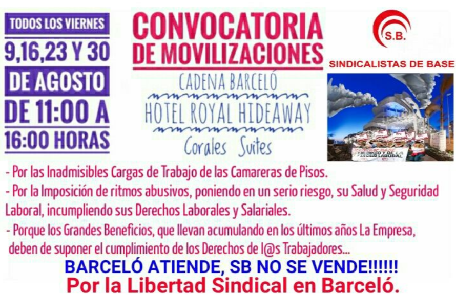 Sindicalistas de Base quiere comunicar a la opinión pública que las movilizaciones contra la cadena Barcelo en Fuerteventura desarrolladas en los últimos meses se desplazan a la isla de Tenerife con las concentraciones de protesta que se van a desarrollar a partir de mañana 9 de Agosto, todos los viernes del citado mes, de las 11.00 a las 16.00 horas a las puertas del Hotel Royal Hideaway Corales Suites de la citada cadena hotelera en La Caleta de Adeje.